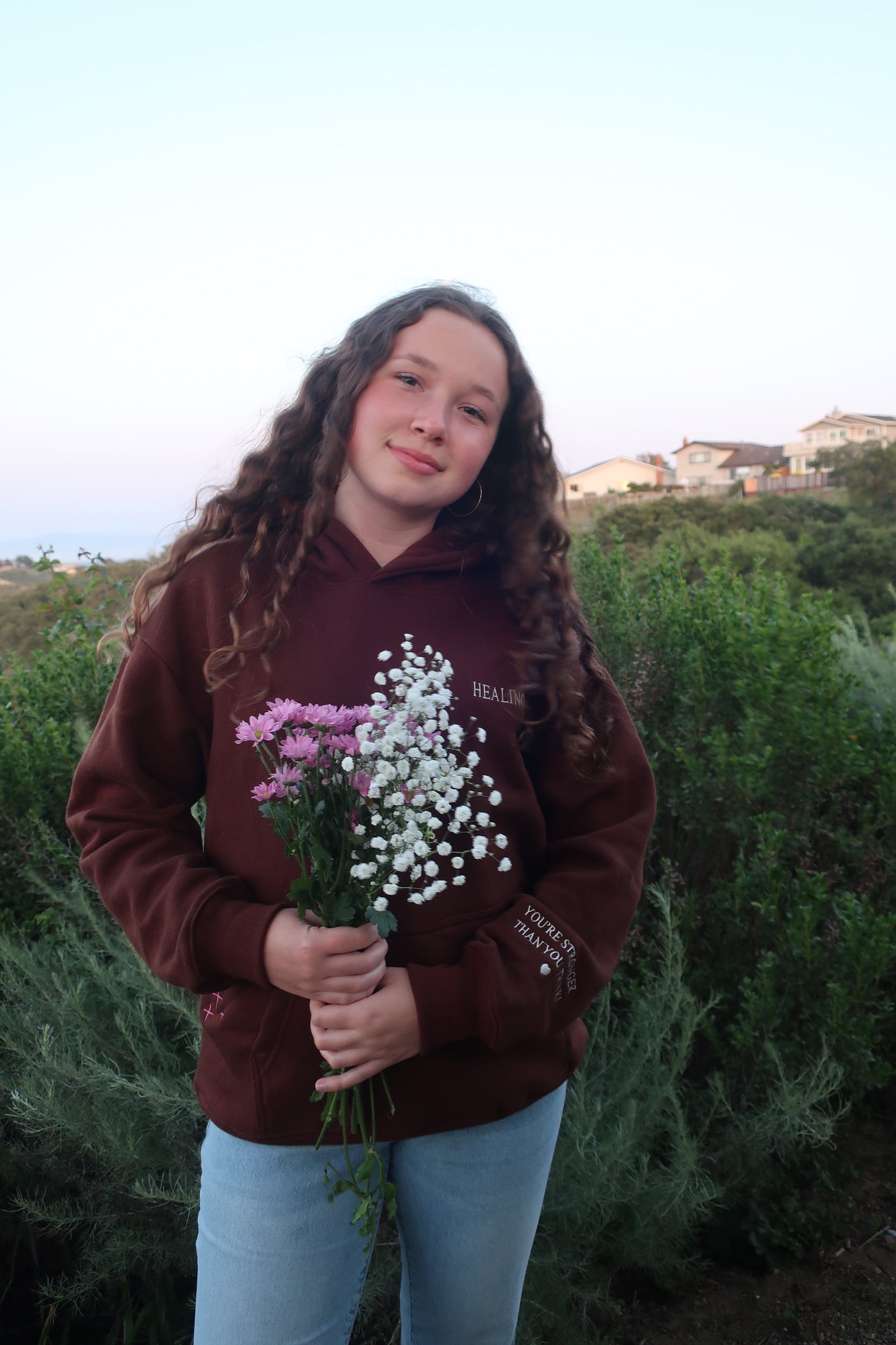 A.S. this hoodie is one of the most comfortable hoodies i own!! the material is so thick and soft, and the hood is huge which i love. the message behind it is so amazing, and i love the positivity i spread while wearing the hoodie! super super great, def recommend!!!!!